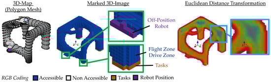 It has been shown that the generation of a digital twin by skeletonization can react directly to changing circumstances. Thus, new obstacles and tasks can be recognized implicitly. Likewise, alternative routes can be found, and 3D maps can be generated. While in Figure 22 the drivable area is modeled by flat 3D surfaces, so-called flight zones and drivable zones can also be considered as3D images. Figure 23 shows a simple 3D model with a robot and a helicopter. The drivable region is captured as a polygon mesh that can be rasterized into a 3D image. The individual volumetric pixels (voxels) are then labeled with their respective tasks and positions of the robot. The distance transformation must now be generated based on the 3D object, so that the height can be considered in addition to the length and width.