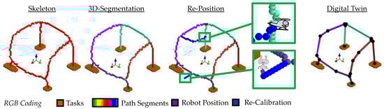 Based on the 3D image, a skeleton can be created and further segmented (see Figure 24). In addition, individual robots or drones can be re-positioned to the paths. Finally, the digital twin can be obtained in the form of a graph by using the distance transformation and the generated paths.
