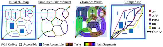 To compare the proposed path finding with alternative methods, the 2D map from [24] is redesigned and added with the path provided by the skeletonization method in combination with A*. Figure 25 shows the original map, the simplified environment, the clearance width of each path, and the comparison of the paths with alternative path finding methods.