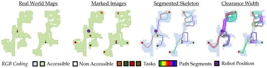 Another alternative for the calculation of these skeletons is the use of the extreme values of the so-called distance transformation [28]. In this case, the individual skeleton branches are recorded on the basis of extreme values. Since this information is used directly in the skeletonization, a maximum passage width along the path can be integrated automatically. Therefore, individual robots can be instructed with different-sized packages to only passable paths. In this work, in addition to path generation, the maximum passage width is also extracted based on skeletonization. Since both passage width and skeletonization are based on a similar theoretical model (Blum’s maximally inscribed balls), this leads to a robust algorithm without the necessity to cover special cases.