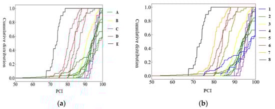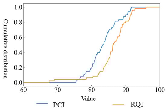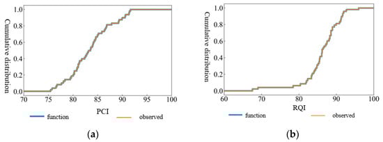 - For each road section, based on Equations (4) and (5), the discrete cumulative frequency distribution data of road performance indexes are continuous to obtain a continuous equation.