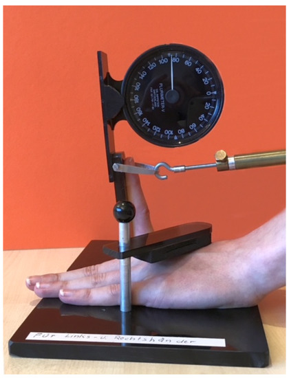 Between 1998 and 2017, vocational ballet students of the John Cranko School (JCS), Germany, were examined by an orthopedist and dance physician. Affiliated with the Stuttgart Ballet of the Württemberg State Theater, this school trains vocational ballet students and is one of the most renowned ballet schools in the world [24]. The present study examined n = 606 students (414 female, 192 male), of an average age of 13.9 years (SD (Range): 3.5 (5–22 years)). High cross-cultural diversity was evident (49 countries, 5 continents). Those examined were in the ongoing admission process for ballet school (pre-school, grades 1–6), vocational school/state ballet academy, or had already been admitted. The subjects were examined for musculoskeletal and sociodemographic characteristics. Missing data in each characteristic category resulted in different numbers (n). In retrospect, it remains unclear why every student was not screened for every characteristic. For a good overview and transparency, the respective N are given in Table 1, and in the other tables after each category. Characteristic expressions were surveyed quantitatively or qualitatively. Data collection and documentation were carried out by history taking, inspection, and examination using a laptop, examination table, length measuring device, tape measure, body scale, and Jules Rippstein’s Plurimeter system: Pluri-Ligament for measuring mobility of the index metacarpophalangeal joint (iMCP), Puritor C for measuring external and internal rotation of the hip (ER/IR), Pluritor T for tibial torsion (TT) and Pluri-Ped for ankle joint ROM (Figure 1, Figure 2, Figure 3 and Figure 4) [7,15,25].