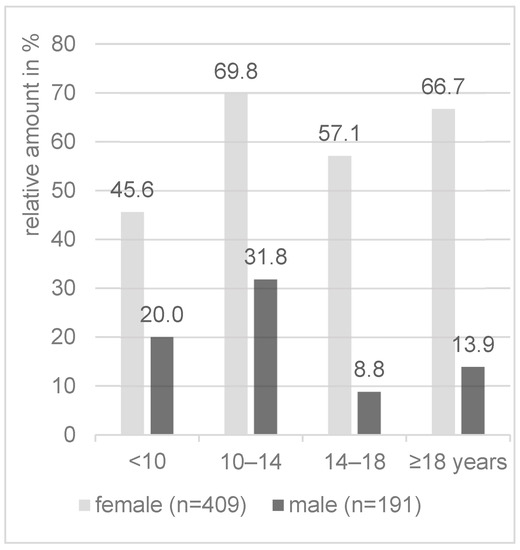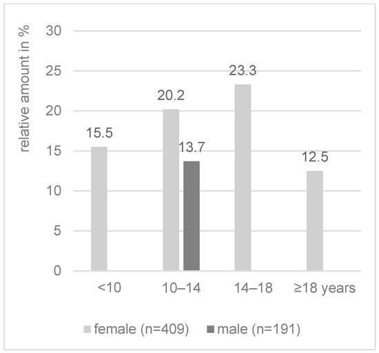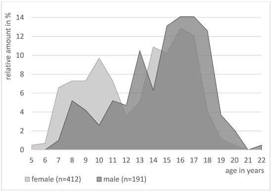 The female examinees were younger than the males (13.4/15.1 years, U = 28097.50, Z = −5.625, p < 0.001) (Table 2). At the time of the study, 23.1% of the female and 20.6% of the male participants were dependent on a vision aid. This difference was not significant (χ2(1) = 0.44, p = 0.51). Figure 5 illustrates two frequency peaks for female and one for male students in the age groups examined.
