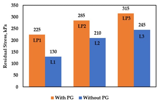 Residual strength of PG amended lime-stabilized soil is the strength calculated from the stress-strain graph of the soil as a result of static deviatoric stress. The fracture/breaking point of the modified soil under varying strain with constant stress gives the residual strength. From the Figure 1 it is observed that the soil underwent strain softening and where the soil is compacted at the maximum dry density it has started flocculating under varying strain, causing dilation. The value of residual strength increases with an increase in lime and PG content (Figure 3). Similar to the modulus behavior, the contribution of PG to the residual strength of the lime-stabilized soil is more when the lime content is lesser than the ICL, i.e., LP1. The increase in residual strength for LP1, LP2 and LP3 are 1.7, 1.36 and 1.29 times that of L1, L2 and L3, respectively. Thus, it can be concluded that the addition of optimum PG content to the lime-stabilization of expansive soils improves the residual strength of the soil. However, similar to the modulus, the contribution of PG toward an increase in residual strength decreases with the increase in lime content.