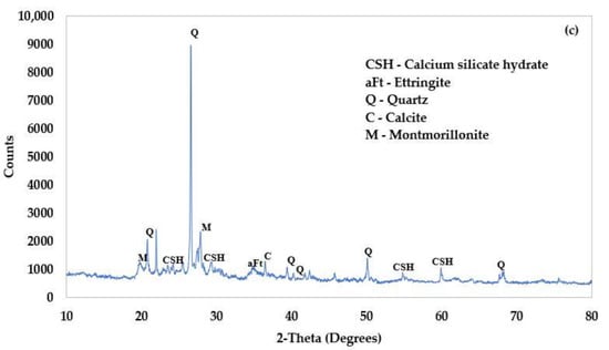 The addition of PG to the lime-stabilization of soil results in modifications in the end products formed during the pozzolanic reactions. The primary constituent of PG is calcium sulfate (CaSO4.2H2O) [22]. As a result of this, sulfate ions are introduced into lime soil reactions. The mechanism of strength development due to the addition of PG can be attributed to the formation of the mineral ettringite. Several researchers have reported the formation of ettringite in lime sulfate systems [35,36,37]. In most of the cases, the ettringite formed was associated with swelling, resulting in the poor performance of the stabilized soils. However, several researchers who had earlier worked on PG admixed systems have attributed the formation of ettringite as the reason for the early strength gain [21,22,38,39]. With increasing curing periods, PG is consumed in the formation of ettringite. Huang and Lin [39] identified increasing peaks of ettringite coupled with decreasing peaks of gypsum in their X-ray diffraction study indicating the consumption of PG in PG-fly ash-limestone systems. PG also hastens the pozzolanic reaction in PG-lime-fly ash systems [21]. Min et al. [22] report that the formation of ettringite hastens the pozzolanic reactions. Huang and Lin [40] also reported increased strength in PG admixed cement systems due to the formation of ettringite. The formation of ettringite in sulfate systems is given by (2), (3) and (4) [22,38].