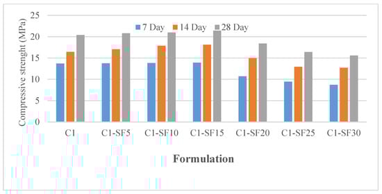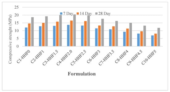 The replacement of cement with supplementary raw materials (human hair as a fiber) and cement with SF causes the concrete to behave differently. Figure 2 shows that the initial (7, 14, and 28 days) strength of SF concrete mix with 5%, 10%, 15%, 20%, 25%, and 30% replacement of cement has the highest strength among all other formulations and that the final (28 days) strength of SF concrete mix with a 15% replacement of cement has relatively more strength than HHFC concrete mix. As a result, compared to merely HHFC concrete, SF helps improve the final strength of HHFC concrete. The compressive strength of the concrete mix decreases up to 20% (28 days) with 30% SF substitution by cement, and the compressive strength of concrete C3-SF-20 decreases the compressive strength of the HHFC specimen. The SF of up to 15% helps to increase the compressive strength by aiding the pozzolanic effect [32]. Moreover, a higher dosage 30% of SF also plays a key role in decreasing the compressive strength by limiting the pozzolanic reaction. The mechanical properties of the HHFC with the addition of 15% SF, on the other hand, tend to improve.