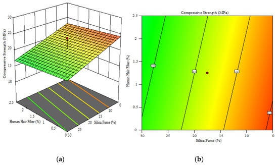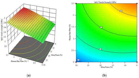 The highest splitting tensile strength, 2.5 MPa, was determined using the 2D contour and 3D response surface plots shown in Figure 9a,b. The model constructed from the parameters is excellent and appropriate, as evidenced by the observation. On the splitting tensile strength model, the semi-elliptical lines in the contour diagram presented in Figure 10 demonstrate a fair relationship between the human hair fiber and SF. The splitting tensile strength dropped as the amount of SF increased, as shown in the 3D surface diagram.