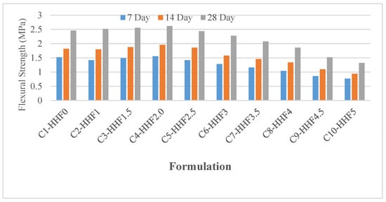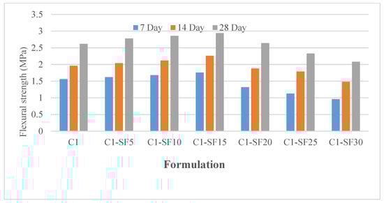 Figure 5 depicts the behavior of HHFC concrete when 15% of the cement is replaced with secondary raw materials (SF). Figure 5 demonstrates that the initial flexural strength of SF concrete mixes at 15% cement replacement causes an increase in flexural strength. Still, it also reveals that the concrete mix’s end (28 days) flexural strength at 15% cement replacement exhibits relatively higher strength than the HHFC mix. In Figure 5, the flexural strength of concrete reduces by 20–40% (28 days) when the percentage of SF is replaced up to 30% by the weight of cement. However, it displays identical strength to the control specimen at 15% SF replacement. Another reason for the improvement in the flexural strength of concrete is possibly because of the filling of the pore’s mechanism of SF. During the hydration process of concrete, SF liberates Ca(OH)2 that causes the increase in strength [32]. Other than SF, the fibers also play a key role in the enhancement of flexural strength [37]. The fibers bridge the cracks at the flexure zone and prolong the cracking scenario, which ultimately increases the compressive strength. The flexural strength of the concrete also follows the compressive strength trend. For an SF dosage of 15%, the trend of flexural strength was positive [21].