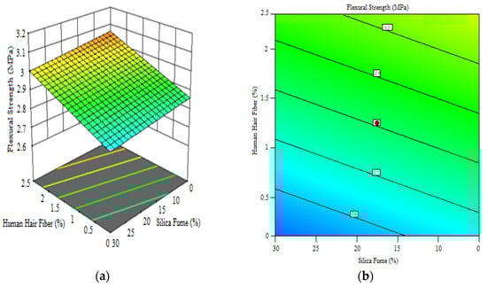 Figure 6 shows the RSM-generated 2D contour and 3D response surface diagrams for flexural strength (a,b). At 2% HHFC and 15% SF content, the highest flexural tensile strength of 2.94 MPa was achieved. However, the slope of the HHFC variable in this model is rather steep, indicating that even small changes in the amounts of HHFC and SF will result in a significant change in flexural tensile strength. When HHFC is fixed, adding more SF to the design mix lowers the flexural tensile strength. This justification supports the straight-line contour plot, which shows how each proportion of the red, green, and blue regions is evenly spread over the plot.