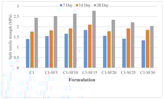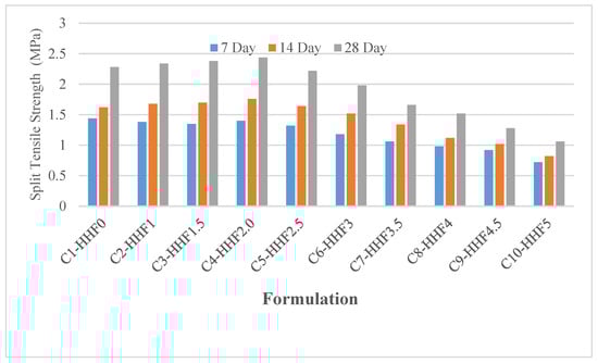 When cement is substituted by SF 5–30% as secondary cementitious materials, a split tensile strength test is performed to evaluate the result of split tensile strength using ASTM Code C496/C496M-15 for concrete cylinders of size 150 × 300 mm at 7, 14, and 28 days each (SF). The HHFC’s split tensile strength was lower than the control concrete mix. The tensile behavior of all concrete mixes is shown in Figure 8 under various combinations. The SF improves the bond strength of concrete due to its high specific area and the pozzolanic activity of the SF. The split tensile strength of HHFC concrete follows the patterns of flexural strength since the major part of this strength is offered by the fibers [38,39].
