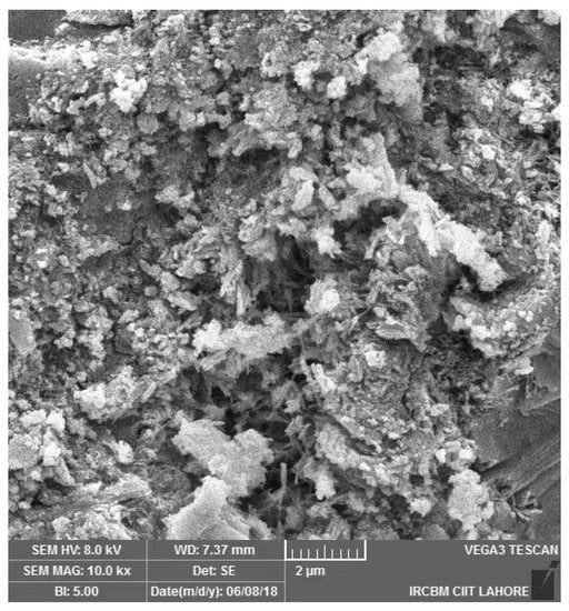 The bulk density of SF varies between 130–430 Kg/m3. When coal is burned at a temperature of 1600 °C (2912 °F), SF is produced. It’s divided into two classes by ASTM [29]. SF, Class F, is a siliceous substance with pozzolanic properties that are widely utilized. To further understand the microstructure of the HHFC, a scanning electronic microscopy (SEM) examination was performed, as shown in Figure 10 and Figure 11. It aided in the comprehension of C-S-H formation mechanisms as well as the identification of flaws in the interfacial transition zone (ITZ), voids, and internal micro porosity. Both with HHFC and SF augmented concrete, SEM data in Figure 10 shows evidence of C-S-H formation, indicating satisfactory hydration. However, the composition in Figure 11 appears to be denser, which could be owing to increased C-S-H formation. Concrete performance was improved by both cement-based C-S-H and SF-based C-S-H forms. The internal spaces formed by free voids of unhydrated cement particles were filled with the human hair fiber, which improved the durability of the concrete matrix. Cement and SF-based C-S-H assist in the densification of concrete mortar, while HHF aids in the filling of voids, improving the overall durability of concrete. To avoid agglomeration, choosing the right fiber ratio is crucial. A ratio of 2% human hair fiber and 15% SF by weight is recommended based on the test results of the current study.