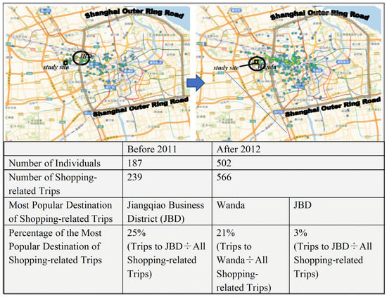 (1) A total of 25% of shopping-related trips’ destinations were located at Jiangqiao Business District (JBD) before the opening of Wanda. After the opening of Wanda, 21% of shopping-related trips’ destinations was Wanda and the visit percentage of JBD declined sharply to 3%. In the heat maps in Figure 1, after the opening of Wanda, the hottest spot for shopping destinations moved from JBD to Wanda.