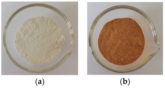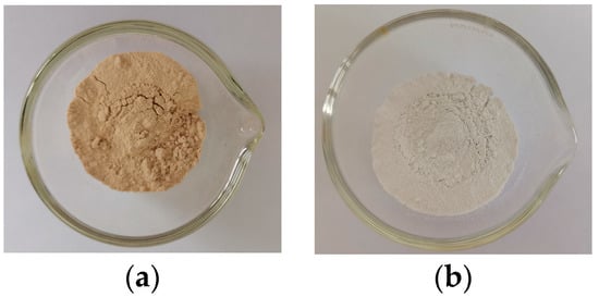 All chemicals (Merck, Darmstadt, Germany) used in this study were of analytical grade and used as received without any further purification. For the production of the lignocellulosic waste cement composites, the following materials were used: cement (CEM, Figure 1a) and vine shoot waste (VSW, Figure 1b). The white cement CEM I 52.5 R used in this study is an ordinary Portland cement type I containing 63 wt.% tricalcium silicate (C3S), 18 wt.% dicalcium silicate (C2S), 10 wt.% tricalcium aluminate (C3A) and 1 wt.% tetracalcium iron aluminate (C4AF), according to the producer. VSW was procured from “Ion Ionescu de la Brad” research station of the University of Agricultural Sciences, Iasi. The vine shoot waste was dried at 105 °C and ground to <100 µm.