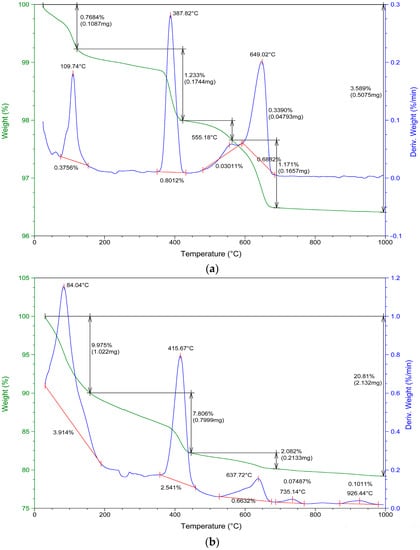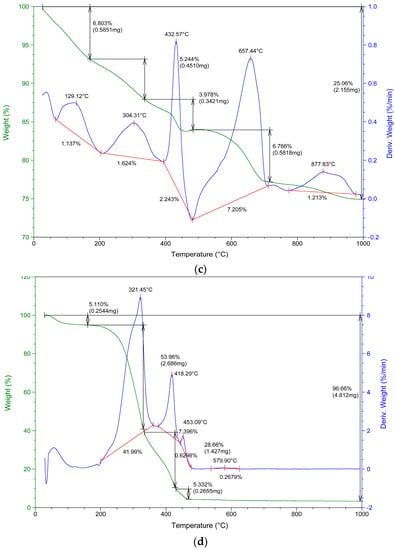 The TGA curves of CEM, CP, CP10VSW and VSW samples are presented in Figure 3a–d. The TGA curve of the CEM sample (Figure 3a) displays three peaks at 109, 387, and 649 °C attributed to gypsum plaster dehydration, CH, and CaCO3, respectively [37]. The TGA curves of the CP (Figure 3b) and CP10VSW (Figure 3c) samples display three distinct effects: (i) the exothermic effect at 100–400 °C corresponds to the removal of water from hydrated products, which are likely to include most cement phases, most of the CSH; (ii) the exothermic effect at 500–570 °C corresponds to the dehydroxylation of a part from CH [38,39]; (iii) the exothermic effect at 700–900 °C may be due to the decalcification of the CaCO3 [40]. Around 800 °C, the weight loss due to carbon dioxide elimination by thermal degradation of the carbonated phase is observed [41]. The TGA curve of the VSW sample (Figure 3d) reveals a slight weight loss due to the water removal at 100 °C, while the peaks at 321 and 418 °C are attributed to the hemicellulose and lignin losses, respectively. The peak at 80–130 °C is attributed to the dehydration of the VSW particle, CSH, and ettringite in the case of CP10VSW and CSH, ettringite in the case of CP. In the case of the CP10VSW sample, the peak at 304 °C is assigned to the decomposition of VSW, at 400–450 °C is attributed to the decomposition of CaCO3, while that at 620–670 °C is attributed to the decarbonization of calcium carbonate, which in CP10VSW is higher than in CP. The peak corresponding to the VSW decomposition may overlap the peaks ascribed to CH decomposition since the degradation of the lignin constituent can continue up to 500 °C, which unfavorably affects the determination CH amount as important information about cement hydration [40].