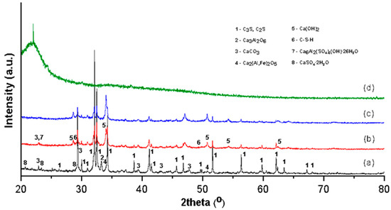 XRD patterns of (a) CEM, (b) CP, (c) CP10VSW and (d) VSW samples.