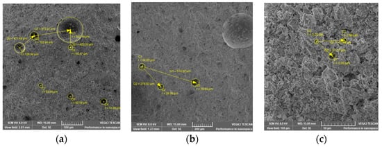 The surface topography, morphology and composition of CP and CP10VSW samples investigated by SEM-EDX are presented in Figure 5, Figure 6, Figure 7 and Figure 8. Based on the analysis of the samples’ topography (Figure 5), the CP sample has a porous surface with holes and small pores, while the CP10VSW sample contains fewer holes and no significant pore structure. Since pore size is one of the factors that influences the transport properties, allowing the harmful matter to pass into the cement’s inner volume [43], several measurements were carried out to identify the type of pore present in the samples (Figure 6). According to the literature [43], four types of pores can be encountered in cement: gel pores (<10 nm), small capillary pores (10–100 nm), large capillary pores (100–1000 nm) and air holes (>several μm). The size of cement pores is directly influenced by the preparation technique (air pores), the water content, and the hydration process of cement grains (gel and capillary pores). In the hydration process, the pore space between cement particles is gradually filled by hydration products reducing the pore size [44]. In the studied sample, the pores’ radius measured for the CP sample varies in 28.96–307.14 μm corresponding to air holes, while for CP10VSW sample, the pores’ radius varies between 2.99–5.86 μm, values which are closer to large capillary pores values. The obtained results suggest a better hydration process in the case of CP10VSW compared with the CP sample.