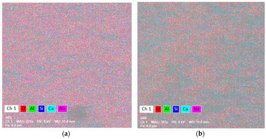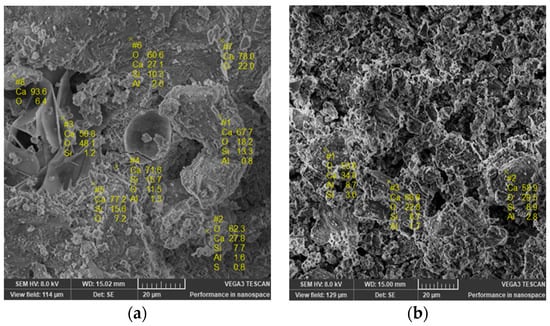 EDX was used to map the surface of the investigated samples. The maps acquired are displayed in Figure 8 and the results are presented in Table 2. The CP10VSW map shows multiple agglomerations of Ca-based phases compared to the CP map. According to the literature, the Ca/Si ratio of CSH in neat Portland cement pastes varies from ~1.2 to ~2.3 while the Ca/(Si+Al) ratio of CSH in cement-slag pastes varies from ~0.7 to ~2.4 [45]. The results presented in Table 1 reveal that both ratios are higher in the case of CP10VSW compared to CP and higher than the values presented above. These results suggest that the introduction of 10% vine shoot waste modifies the surface structure of the obtained cement by favoring the formation of Ca-based phases, such as CH and CaCO3.