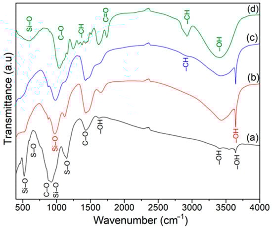 FT-IR spectra of (a) CEM, (b) CP, (c) CP10VSW, (d) VSW samples.