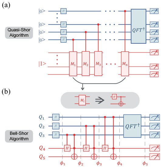 Schematic quantum circuit for quasi-Shor algorithms (a) and Bell–Shor algorithm (b).
