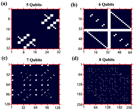 In Figure A3, the final density matrices for the Bell–Shor algorithm k = 6, 7, 8 are displayed with initial states (a), (b), and (c). Interestingly, the zero elements in Figure A3a form a key feature of cross “+” distribution. In the 8-qubit case, these special elements seem to have mirror symmetry concerning the counter-diagonal.