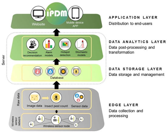 Karar et al. deployed cloud-based solutions and CNN networks to target red spider, flax budworm, cicadellidae, aphids, and flea beetles [14]. Early detection of pesticides using AI technologies would facilitate timely responses using AI and IoT infrastructure. The observations made by Karar et al. [14] were corroborated by Rustia et al., who integrated both AI and IoT systems in developing a new and intelligent system of IPM (see Figure 5). The IPM system shown in Figure 5 shows the use of sensors and image data during the data collection phase, which are then stored in a database and processed within the same server, using analytics to provide useful outputs, such as hotspot detection and other models that can aid decision-making on the farm. The system was > 90% effective in managing thrips and whitefly [57]. In both cases, intelligent IPM techniques had the potential to reduce pesticide usage, resulting in significant cost savings. However, the short-term investment costs are a major impediment [121,123]. The observations made by [60,62] reflect the broader concerns about the future of Al in agriculture highlighted by Karnawat et al. [6]. However, in the latter case, the researchers argued the challenge might be addressed by developing affordable interventions in open-source platforms to ensure higher penetration among farmers.