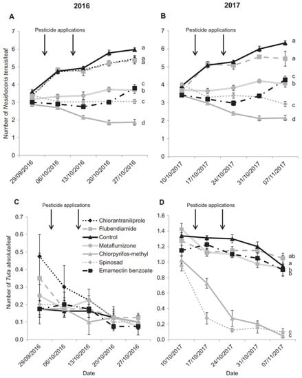 (A,C) show the average population of Nesidiocoris tenuis and Tuta absoluta per leaf inside a commercial greenhouse in 2016, and (B,D) show the average population of the same pests in 2017 after the pesticide was applied twice in 2016 [61].