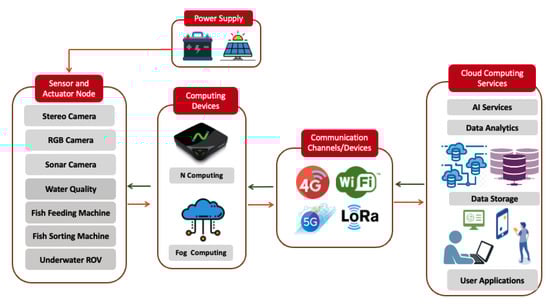 Digital twins facilitate the implementation of digital aquaculture employing smart technologies to perform data acquisition, analysis, and complex decision-making from fish ponds or sea cages [25,26]. As the fusion of big data, real-time information from the individual farm, and AI, digital twins enhance the efficiency of fish farming, maximize production, reduce cost, and optimize the decision-making process. Furthermore, the AIoT tools facilitate intelligent farm management, improve aquaculture operation efficiency, control production quality, and link with the food supply chain and decision support tools [27]. Underwater cameras or sonar imaging devices are essential sensors to capture underwater images, inputted to specific AI functions, and big data analytics to extract management knowledge from fish farms [28,29,30,31,32]. For instance, fish health, growth, and behavior detection can be monitored and controlled using advanced AI and deep learning techniques [33,34]. Data-driven approaches augment on-farm decision-making capabilities, improve fish production, and reduce losses, benefiting farmers. The IoT and wireless technologies enable real-time data transmission and monitoring in digital farming [35,36]. The cloud-based IoT systems facilitate communication between software platforms, sensors, farmers, and aquaculture machinery in digital farming. However, cameras for data collection on fish ponds in rural areas or offshore cages contain large amounts of data, causing a high load on the wireless networks and increasing the latency of data communication. Because of this, the subsequent decision-making process’s response time becomes unreliable due to the delay in transmission. Such limitations can be addressed by a recent smart farming approach, such as edge computing, to enable computation or processing at the network’s edge [36] by reducing the network load and supporting real-time data processing. However, the power supply demand of sensors and edge systems is always a severe issue in digital aquaculture, especially for offshore cages. Although cyber-physical systems have been widely introduced in smart farming systems to develop hardware and software to improve the adaptability, safety, and security of computer-based algorithms and systems [37], only very few digital aquaculture systems are discussed in the literature [38]. With this inadequacy, further studies of how to architect digital twins that support the adaptability, practicality, security, and safety of collected information for better management of aquaculture farms are necessary.
