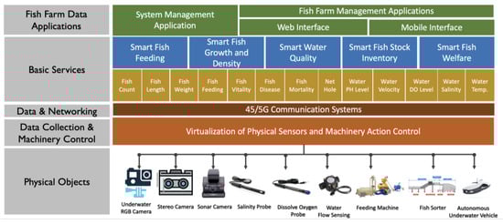This study aims to construct an AIoT system that addresses all the key operations of fish farm management. As shown in Figure 2, the system’s functionality can be implemented using a five-layer digital twin architecture to facilitate the digital transformation for precision aquaculture. The first step of the digital transformation of fish farm management is the virtualization of physical sensors, machinery controllers, and fish ponds or offshore cages. In this phase, every physical object is transformed into the corresponding logic object, also defined as a digital twin. The features, states, prediction models, and action sequences of the physical object are stored in this stage. However, the characteristics of individual physical objects might be very different and thus very difficult to be represented by a generic digital twin template. For instance, both the optical and the sonar cameras could be used to automatically acquire environmental or fish data for monitoring the status of the fish. However, different machine learning tools are often used to analyze their respective captured videos. Next, these logic objects send sensor data which are often fused and integrated into the cloud. The cloud is equipped with machine learning or deep learning prediction models to offer basic services, including water quality prediction models, fish metrics estimation models, and fish food requirements for daily feeding. The basic services provide AI functions to transform unstructured sensor data into structured fish farm information, which is further inputted into the succeeding decision-making processes to establish fish farm data applications. In this system, the fish farm manager uses web interfaces to connect to these data applications for precision aquaculture. Advanced technologies integrating IoT and cloud virtualization techniques facilitate the construction of an AIoT system based on digital twin modeling. Despite this development, the existing industrially available sensors are insufficient to address the issues of low power consumption, high bandwidth networking, waterproofing, and end-computing AI functions. These physical sensors need further improvement before implementing the corresponding logic objects.