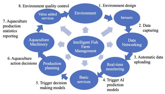 The first step to the digital transformation of fish farm management is to deploy sensors on fish ponds or offshore sea cages to collect fish and environmental data to establish data-driven prediction models. The digital transformation of aquaculture is also defined as Aquaculture 4.0, which follows the concept of Industry 4.0 technologies [2,3] to achieve the goal of precision aquaculture by supporting decision-making based on the utilization of artificial intelligence (AI) and the Internet of Things (IoT) [1,4]. AI technologies, such as information-based management with big data and models, guide the production process and fully understand aquaculture farms’ environmental and fish conditions. On the other hand, IoT technologies characterize intelligent fish farms with surveillance cameras, water inspecting devices, and working sensors to store and serve data to a fog or cloud system through interconnection networks. This digital transformation of aquaculture based on the implementation of the AIoT system facilitates fish farms to optimize operations of a precision aquaculture framework. Therefore, including sensor deployment, cloud big data management, and AI analytics in this framework enables real-time, data-driven decision-making [5].