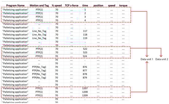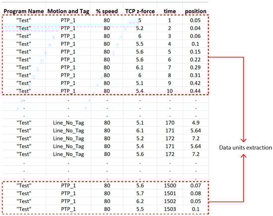 - Acquire, collect and store data. The common questions that we need to answer to obtain a consistent dataset from which to extract information for further analysis are the following: How to manage the data acquisition phase? Which rules do we need to use to collect, organize and store data? To answer these questions, there is a need to go deeper into the details of a cobot application; however, it is easy to understand that it is not trivial to decide on a strategy to acquire data in a system that performs different combinations of movements, reaching many different positions at different speeds, sometimes carrying different payloads, all in the same program. In fact, those systems are thought of for flexible production and may be used for many different tasks contemporary. Therefore, in Section 3.3, we propose a methodology to solve these issues and we test its validity in a case study application common in Industrial scenarios in Section 4.
