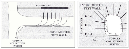 In the Heal et al. [14], assessment of in-situ performance of ground support systems subjected to dynamic loading, blasting was the primary technique chosen. Their goal was to investigate rockmass discontinuities, rockmass damage, stress conditions on rockburst damage and the influence of support and reinforcement systems. A diagram of their set up can be seen below in Figure 1.