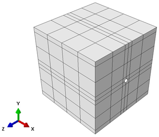 The cube was constructed with an edge length of 500 mm and a circular void that was extruded through the centre of the ZY plane of the cube. The extruded circular void had a diameter equal to the respective bolt diameter under investigation. The cube was then manually subdivided 30 mm from both the top and bottom of the cube to allow for the appointment of rigid bodies. Furthermore, the cube was manually partitioned to improve ABAQUS’ automatic meshing tool, which is further discussed in the mesh generation section. A completed cube with a 28 mm diameter void is displayed below in Figure 2.