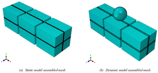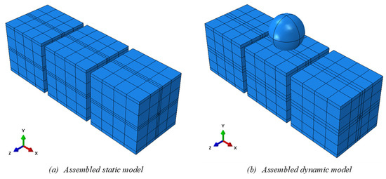 The model was assembled such that the bolt was threaded perfectly through the holes of the three concrete boxes. A 50 mm gap was created between each concrete block to prevent the blocks from contacting each other, preventing resistance through friction. This was done such that excess contact properties could be avoided and thus reduce the computational time to run the model. For dynamic tests, the load sphere was placed above the centre of the middle concrete block, where the bottom of the sphere and the top of the central block were in contact. Figure 6 displays the assembled static and dynamic numerical models.