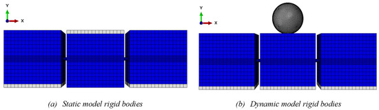 As the focus of the double shear test and the scope of this study is to conduct a study on bolt performance, rigid bodies will be applied to all concrete boxes to prevent unnecessary deformation. For static testing, the boundary blocks had rigid bodies assigned to the bottom 30 mm partition, whilst the centre block had a rigid body assigned to the top 30 mm partition, which will act as the loading cell. For dynamic testing, all three concrete boxes were assigned a rigid body to the bottom 30 mm partition. As the load sphere deformation is not under investigation, the entire sphere was assigned as a rigid body. Figure 7 displays the assigned rigid bodies in white for both static and dynamic models.