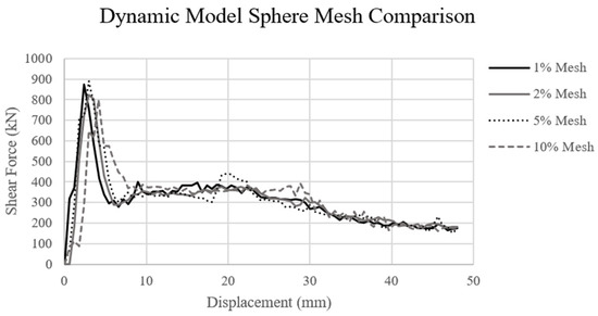 The double shear test requires the two boundary blocks to be fixed in all degrees of freedom, with the centre box restricted to displace in the direction of force applied. To apply this to both the static and dynamic model, the boundary blocks were assigned as rigid bodies and were fixed in all directions and rotational planes. The centre block was fixed in all rotational planes and directions except for the vertical y-plane. For dynamic testing, as shear capacity is the focus of the investigation, the load sphere was fixed in all directions except it was free to move in the vertical plane. To prevent slippage of the bolt during shearing, the ends of the tested bolt were completely fixed.