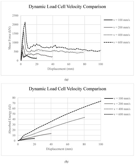 To apply a load to the numerical test, a boundary condition was applied to the load cell, where the load cell was forced to move downwards in only the vertical direction at a defined velocity. As quasi-static analysis was utilised, the loading rate is negligible if inertial forces do not exceed quasi-static boundaries, thus the load cell (the centre block’s rigid body) was forced to move down at a velocity of 100 mm/s. For dynamic testing, the load cell velocity was varied at velocities of 100, 200, 400 and 600 mm/s.
