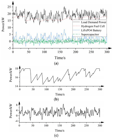 The logic threshold rule is shown in Figure 7. It can be seen that using the logic rule, the sub-high-frequency power in the low-frequency power is allocated to the LiFePO4 battery, while the steady-state power is allocated to the PEMFC. When a power surge occurs, if the demand power and its fluctuation ratio are within the allowed threshold, the hydrogen fuel cell will carry out all the power output; when the demand power or its fluctuation ratio exceeds the allowed threshold, the hydrogen fuel cell will only carry out the power output within the threshold of the rule fluctuation ratio. The part beyond the threshold will be provided by the LiFePO4 battery, thus realizing the second layer of decoupling of the low-frequency power.