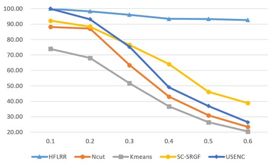 Table 1 lists the set-ups for the objective datasets and the indexes of those set-ups. Table 2 presents the clustering results with the five performance indicators mentioned above. The results in the table clearly show that HFLRSC not only achieved the best results in all datasets but also achieved 100% excellent performance in five indicators in half of the datasets. With the increase in noise intensity, the performance of the general methods would fall strongly. Specifically, in the process of Gaussian noise rising from 0.1 to 0.6, the accuracy of NCUT and K-means decreased significantly by 64.87% and 53.48%, respectively. The accuracy of HFLRSC was very stable, and even the lowest could reach a 92.62% result, which shows that our method has a very obvious effect on noise suppression and can effectively extract valuable information from low-quality IC images.
