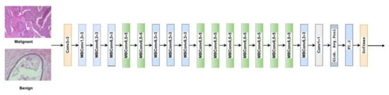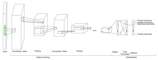 As a result of limited knowledge and availability of experts, between 10% and 30% of BCs go undetected during regular screenings. The accuracy of manual BC screening varies according to the pathologist’s experience and knowledge, and diagnoses can be incorrect due to human error. Automated computer screening systems for breast cancer classification and identification have been proposed to automatically diagnose malignancy, improving the accuracy and consistency of differentiating the normal vs. abnormal classes of breast tissues by about 10% []. Computer aided diagnosis (CAD) systems are accessible, fast, and reliable []. Machine learning using handcrafted image features was used in previous image-based breast cancer classification studies [,,]. Recently, due to their demonstrated impressive performance, deep convolutional neural networks (DCNNs) have become increasingly popular for medical image analysis, segmentation, classification, and ailment prediction []. Breast cancer can be detected by automated therapeutic imaging techniques such as histopathological imaging, computed tomography, breast X-rays, sonograms, and magnetic resonance imaging []. Currently, histopathological images are considered the best diagnostic images for cancer diagnosis []. Several top-down and bottom-up image analyses rely on automated and exact classification of histopathological images, such as classifying nuclei, detecting mitosis, and segmenting glands []. Tumor classification, however, is the most critical step in histopathological image examination. A wide range of image analysis tasks can be performed with convolutional neural networks (CNNs), including image classification, disease detection, localization, segmentation [], and the analyses of histopathological images [].