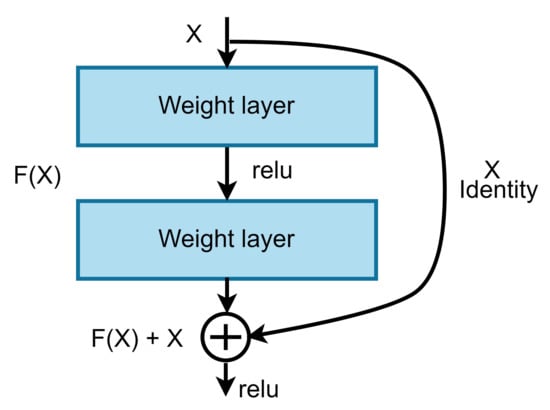 ResNet50 []: introduced a deep residual learning structure, which reformulates the CNN’s layers as learning residual functions of the layer inputs. Correctly denoting the desired underlying mapping as , the stacked non-linear layers were made to fit another mapping of . ResNet solved the vanishing gradient, whereby the value of the neural network’s gradient decreases significantly during backpropagation until its weights barely change. ResNet solved the vanishing gradient problem using a skip connection, by adding the original input to the output of the convolutional block. A skip connection is a direct connection that skips over some of the model layers and can be expressed as , where represents the residual mapping to be learned. Resnet utilizes the SGD optimizer with momentum given by Equation (11)