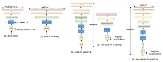 Tan and Le [] introduced a compound scaling method to increase the efficiency of a baseline model without altering the layered architecture. Tan and Le [] named the variant CNN models EfficientNets. Instead of arbitrarily scaling the convNets depth, width, or image size, EfficientNets uniformly scale all three with a constant ratio. Figure 4 illustrates the compound scaling of convNets.