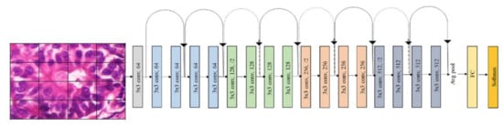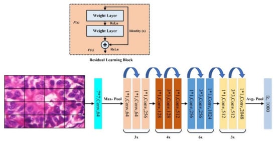 ResNet18 []: ResNet has three variants according to its number of layers: ResNet18, ResNet50, and ResNet101 with 18, 50, and 101 layers, respectively. A transfer learning algorithm based on ResNet has been successfully used to classify biomedical images. ResNet18, shown in Figure 5, was used for feature extraction in this paper. The deep neural network layers learn low or high-level features during training, whereas the ResNet layer learns residuals instead.