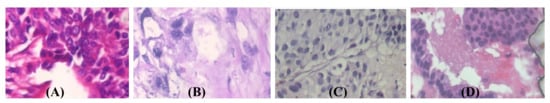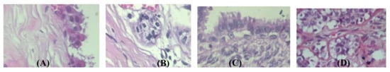 Sample of malignant subtypes: (A) ductal carcinoma; (B) lobular carcinoma; (C) mucinous carcinoma; (D) papillary carcinoma.