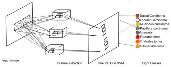 However, in this study, we use the one-vs-one technique with SVM for the eight-class classification of the 8 cancer subtypes from breast cancer images. Recall that SoftMax is a generalization of logistic regression, and logistic regression is susceptible to overfitting. Replacing SoftMax with SVM will guarantee convergence. As it is well known, the cost function of SVM is convex. In the one-vs-one technique, a pairwise SVM classifier of the breast cancer image classes is modeled using the training features extracted. A total of 28 SVM classifiers are built for the 8 classes of breast cancer datasets based on the formula where k is the number of classes. Finally, a test breast cancer image is predicted based on the class output of the SVM models with a majority of counts. This model uses a heuristic technique to classify into one target class. This method is different from the previous method in [], which first classifies input data into benign or malignant binary classes before being further categorized using two modules; one for benign and the other for malignant. Each module contains a ConvNet structure with a decision tree for subclass classification.