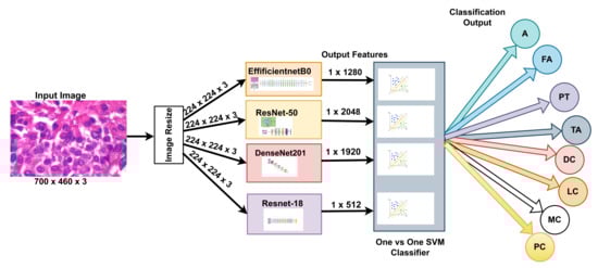 Our approach: In this study, a method for multiclass classification of breast cancer using an ensemble of pre-trained deep convolutional neural network (DCNN) and SVM, is proposed. First, four state-of-the-art DCNN backbone models (1) ResNet50 [], (2) ResNet18 [], (3) DenseNet201 [], and (4) EfficientNetb0 [] were used for feature extraction. The models were used to extract rich multi-resolution features from four resolutions (40×, 100×, 200×, and 400×) of histopathological breast cancer images. The rich multiresolution features were then pooled using global average pooling to create an array of deep multiresolution convolutional features, SVM classifier performs multiclassification (8sub-types) of malignant and benign tumors. SVM algorithms always converge at a global minimum when provided with a suitable feature set irrespective of the dimensionality of the inputs. The target malignant breast cancer classes are ductal carcinoma in situ, lobular carcinoma, mucinous carcinoma, and papillary carcinoma subtypes, and the benign breast cancer target classes are adenosis, fibroadenoma, phyllodes tumor, and tubular adenoma subtypes. Methods for extracting image features fall into three main categories []: (1) Automatic feature extraction using deep learning, (2) handcrafted features, and (3) unsupervised feature learning. Manual feature extraction is tedious and error-prone. EffficientNetb0 is the baseline model for EfficientNet, which uses compound scaling, a novel scaling method, to scale the model’s dimensions uniformly to increase performance. With ResNet-50, deep residual networks are constructed with 50 layers of residual blocks, which mitigates the vanishing gradient descent problem to maintain accuracy as the depth of the network increases. In contrast to the previously described neural networks, ResNet18 is a gateless or open-gated variant of the highway-net, the first working very deep feedforward neural network. Some layers can be jumped over by using skip connections. In typical implementations, it includes double- or triple-layer skips with nonlinearities and batch normalizations. DenseNet-201 is a convolutional neural network that is 201 layers deep. It utilizes dense connections between layers through dense blocks, where all layers are connected directly. Each layer receives additional inputs from all preceding layers and passes its feature maps to all subsequent layers to preserve the feed-forward nature. The feature extraction step is fundamental to the analysis of medical images using machine learning, and a variety of extraction strategies have been proposed in the past for the classification of various diseases using images [,,,].