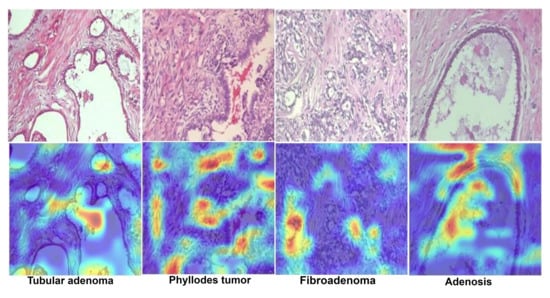 Breast cancer (BC) causes cells in the breast to develop uncontrollably, which can lead to tumor growth and death if not detected early. In 2018, an estimated 627,000 women died from BC, which corresponds to 15% of the total cancer mortality in women []. A recent study by the American Cancer Society (ACS) suggests that one in eight women in the US will develop cancer in their lifetime []. Globally, BC is a leading type of cancer among women, affecting about 2.1 million women annually, and has been the leading cause of death associated with cancer among women []. Early detection and classification of breast cancer subtypes are crucial in deciding the best treatment plan and mitigating the risk of death. According to the World Health Organization (WHO), increasing the survival rates of patients with breast cancer significantly requires early and precise diagnosis of malignancy []. There are two kinds of growth in breast tissue, non-harmful (benign) and malignant, with subtypes occurring in each category. Non-harmful (benign) growth patterns include adenosis (A), fibroadenoma (FA), phyllodes tumor (PT), and tubular adenoma (TA), and dangerous (malignant or cancerous) growth patterns include ductal carcinoma (DC), lobular carcinoma (LB), mucinous carcinoma (MC), and papillary carcinoma (PC). These subtypes of BC have distinct biological features, leading to different response patterns to various treatment modalities and thus have varied clinical outcomes. Consequently, to ensure that sufferers receive lifesaving, patient-tailored treatment early, it is very important to accurately distinguish dangerous malignant subtypes of tumors from benign harmless subtypes [] during patient assessments. Global gene expression profiling (GEP) [] studies have shown that survival is associated with the classification of distinct biological classes.