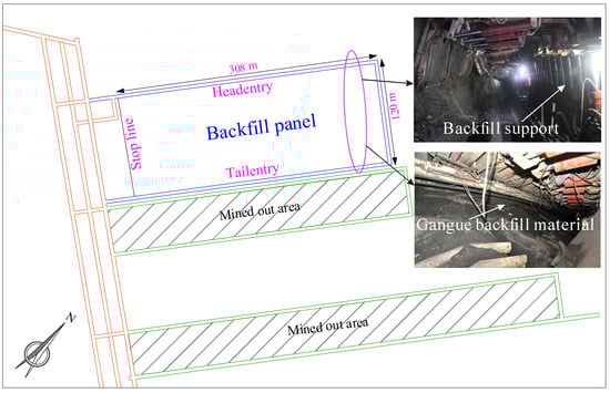 Much coal gangue waste is stacked on the ground around Tangshan Coal Mine. To dispose of the stacked coal gangue and overcome problems, including environmental pollution and geological disasters caused thereby, the coal mine owners decided to backfill coal gangue wastes to support underground goafs. That is, coal gangue is broken, then transported underground through a vertical feeding system, and carried to the backfill panel using an underground transportation system. Afterwards, the broken coal gangue is filled into the goaf using equipment, including backfill supports and a conveyor. We took a backfill panel in Tangshan Coal Mine as the engineering background (Figure 1), which had a length of 120 m, a strike length of 308 m, an average coal seam thickness of 3.7 m, an average burial depth of 725 m, and design recoverable reserves of 2.176 × 105 t. The immediate roof above the coal seam is fine sandstone with average thickness of 2.8 m, and the main roof mainly comprises medium-grained sandstone with average thickness of 4.5 m.