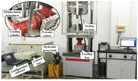 The axial loading system mainly comprised a WAW-1000D electro-hydraulic servo-motor universal testing machine, which could provide the maximum axial load of 1000 kN with a stroke of 0 to 250 mm. The loading box provided space for loading backfill materials, and its effective space measured 250 mm × 200 mm × 200 mm (length × width × height). The lateral loading system was composed of a hydraulic power unit, a loading cylinder, and a control box. The stroke range and maximum lateral pressure of the loading cylinder were 0 to 100 mm and 7 MPa, respectively. The data-monitoring and acquisition system, consisting of a displacement transducer, a pressure sensor, MCGS configuration software, and a laptop, could monitor changes in the pressure and displacement in the test process and acquire and store data (all in real time).