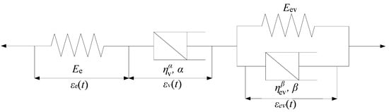 where Ee and Eev separately represent elastic moduli; and are viscosity coefficients; α and β are fractional orders; t denotes the creep duration; εe(t), εv(t), and εev(t) represent the strain of elastic, viscous, and visco-elastic elements, respectively.