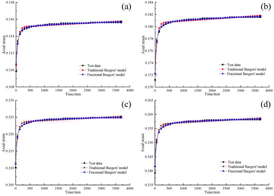The creep data of gangue backfill materials were subjected to non-linear fitting, and the parameters of the fractional Burgers’ model were identified. Moreover, the model was compared with the traditional Burgers’ model (Figure 6).